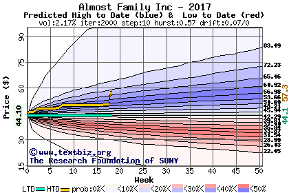 The high to date and low to date prices of the stock plotted against a random walk model for 2017 (what's this?).