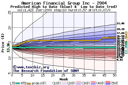 The high to date and low to date prices of the stock plotted against a random walk model for 2004 (what's this?).