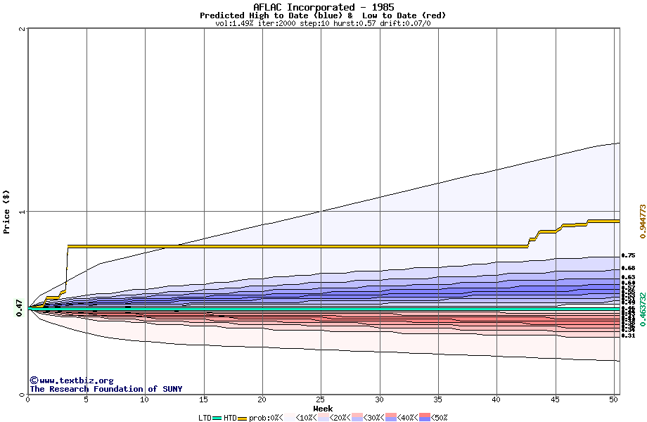 The high to date and low to date prices of the stock plotted against a random walk model for 1985 (what's this?).