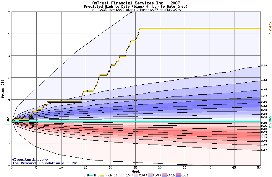 The high to date and low to date prices of the stock plotted against a random walk model for 2007 (what's this?).