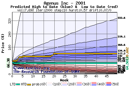 The high to date and low to date prices of the stock plotted against a random walk model for 2001 (what's this?).
