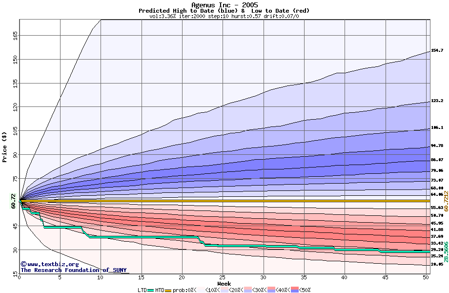 The high to date and low to date prices of the stock plotted against a random walk model for 2005 (what's this?).