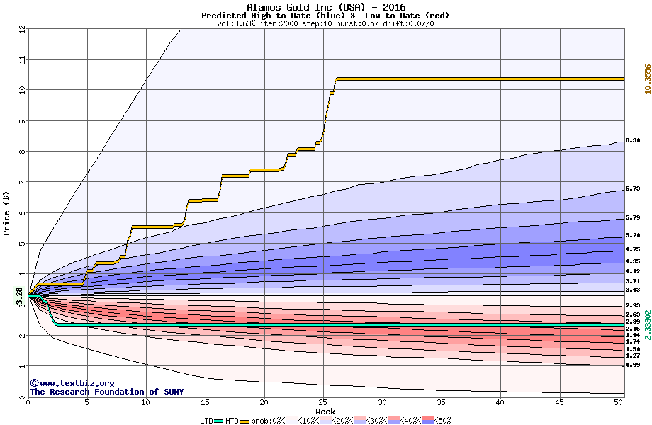 The high to date and low to date prices of the stock plotted against a random walk model for 2016 (what's this?).