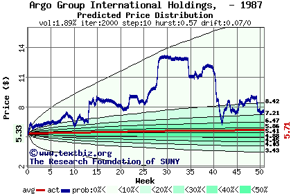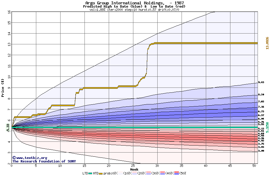 The high to date and low to date prices of the stock plotted against a random walk model for 1987 (what's this?).