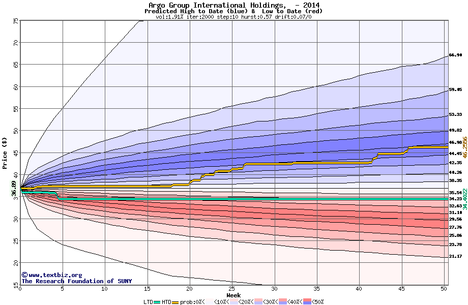 The following graph plots the year-to-date performance of the stock for 2014 compared to the probability calculated by a random walk model.