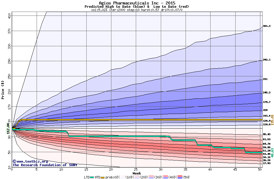 The high to date and low to date prices of the stock plotted against a random walk model for 2015 (what's this?).