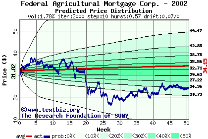 The high to date and low to date prices of the stock plotted against a random walk model for 2002 (what's this?).
