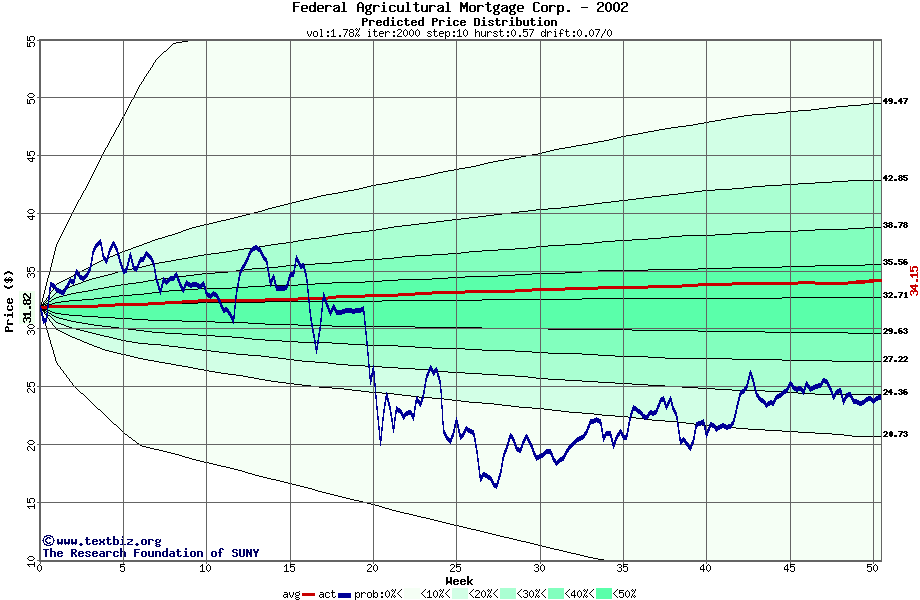 The following graph plots the year-to-date performance of the stock for 2002 compared to the probability calculated by a random walk model.