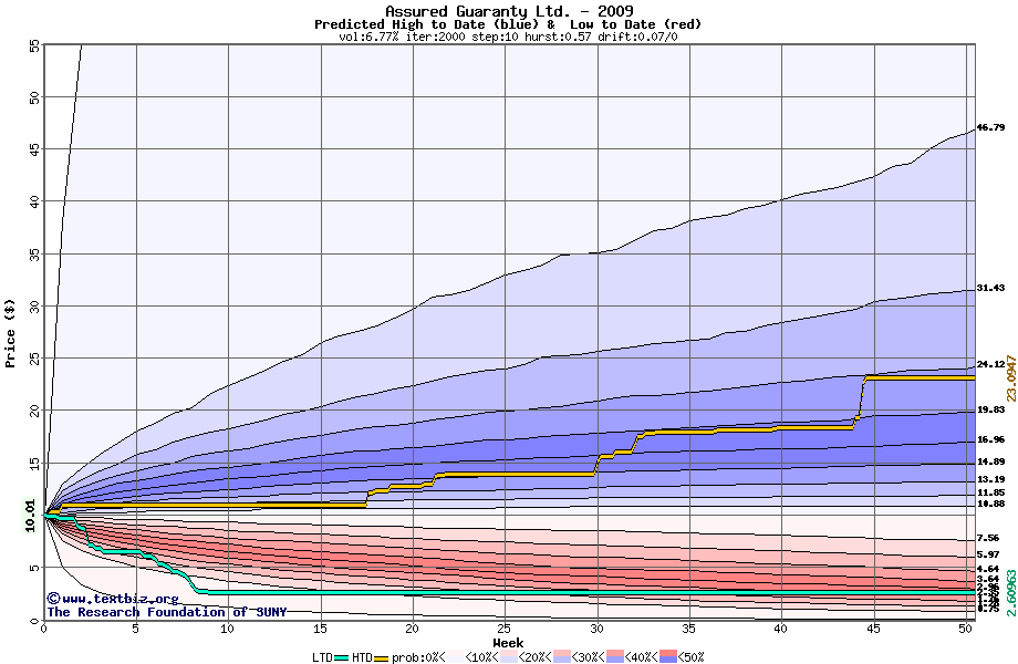 The high to date and low to date prices of the stock plotted against a random walk model for 2009 (what's this?).
