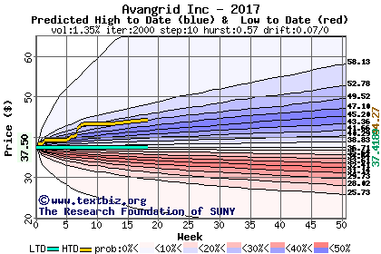 The high to date and low to date prices of the stock plotted against a random walk model for 2017 (what's this?).