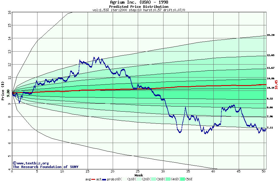The following graph plots the year-to-date performance of the stock for 1998 compared to the probability calculated by a random walk model.