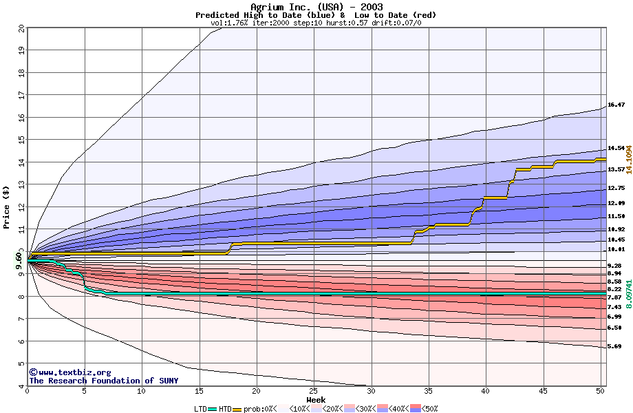 The high to date and low to date prices of the stock plotted against a random walk model for 2003 (what's this?).