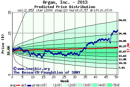 The high to date and low to date prices of the stock plotted against a random walk model for 2013 (what's this?).
