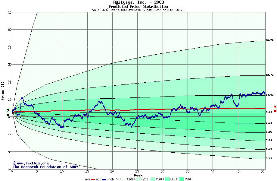 The following graph plots the year-to-date performance of the stock for 2003 compared to the probability calculated by a random walk model.