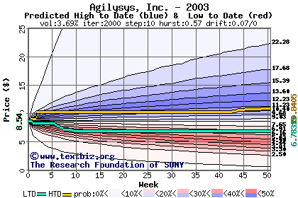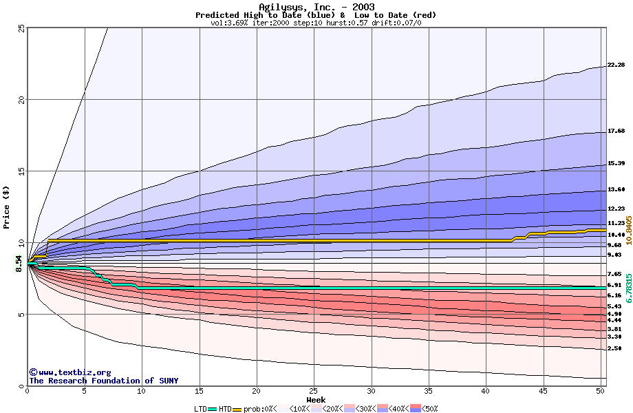 The high to date and low to date prices of the stock plotted against a random walk model for 2003 (what's this?).