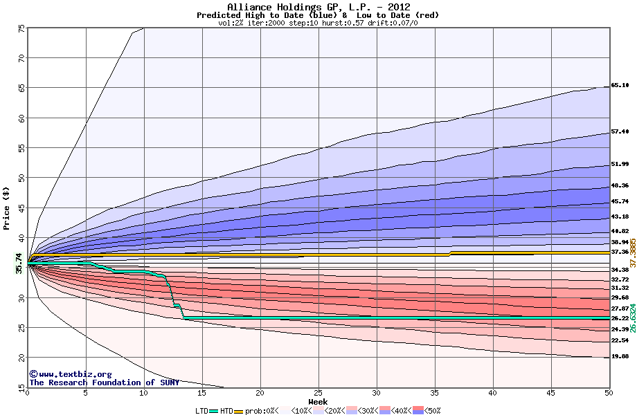 The high to date and low to date prices of the stock plotted against a random walk model for 2012 (what's this?).
