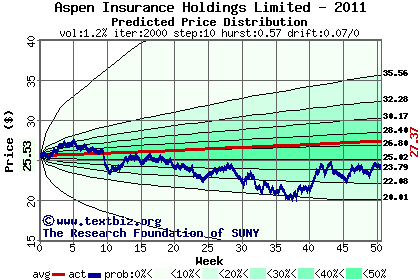 The high to date and low to date prices of the stock plotted against a random walk model for 2011 (what's this?).
