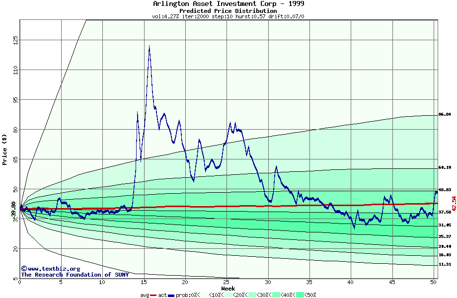 The following graph plots the year-to-date performance of the stock for 1999 compared to the probability calculated by a random walk model.