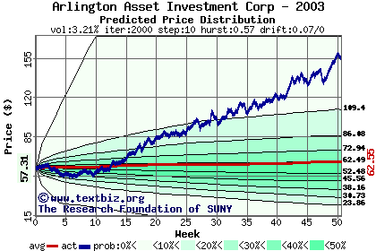 The high to date and low to date prices of the stock plotted against a random walk model for 2003 (what's this?).