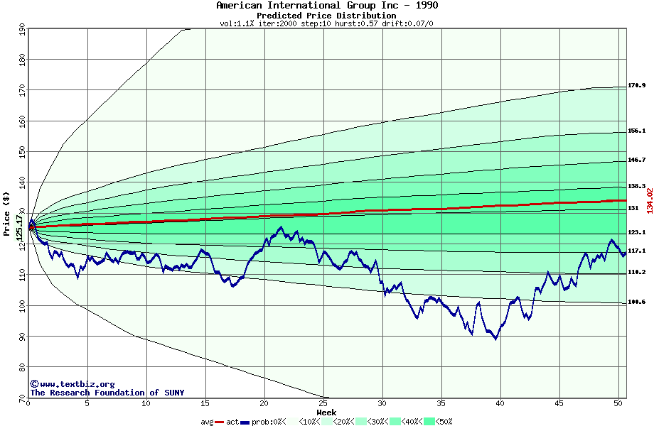 The following graph plots the year-to-date performance of the stock for 1990 compared to the probability calculated by a random walk model.