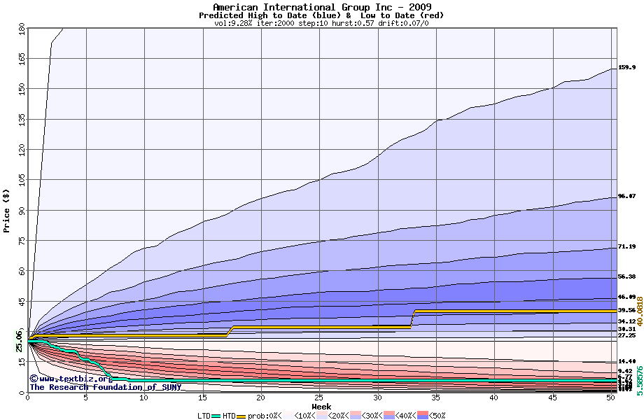 The high to date and low to date prices of the stock plotted against a random walk model for 2009 (what's this?).