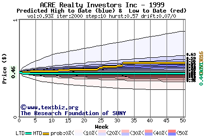 The high to date and low to date prices of the stock plotted against a random walk model for 1999 (what's this?).
