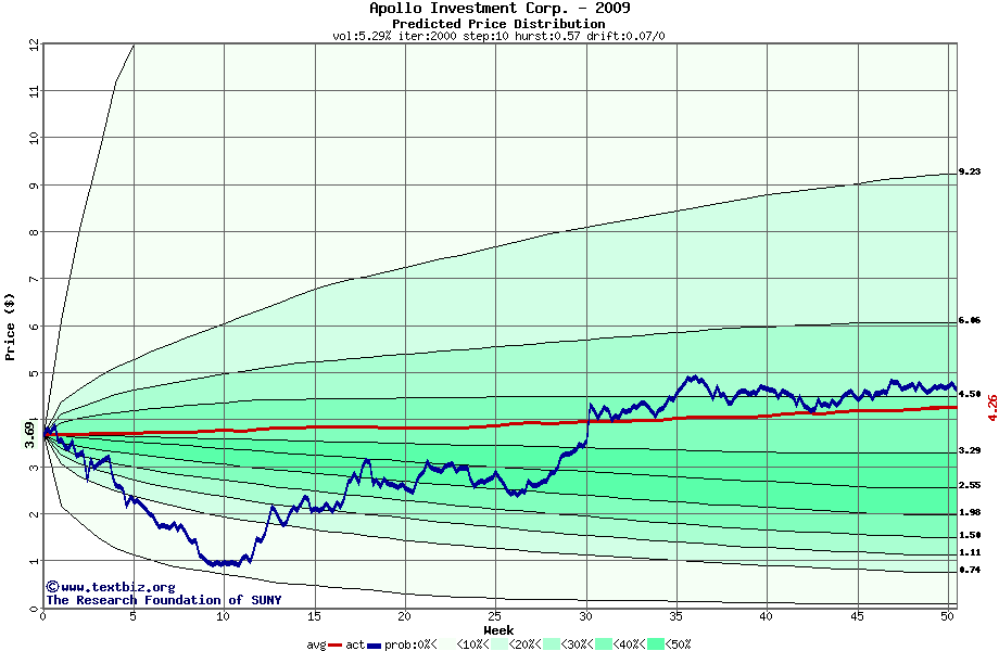 The following graph plots the year-to-date performance of the stock for 2009 compared to the probability calculated by a random walk model.