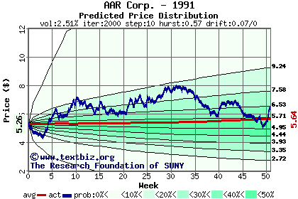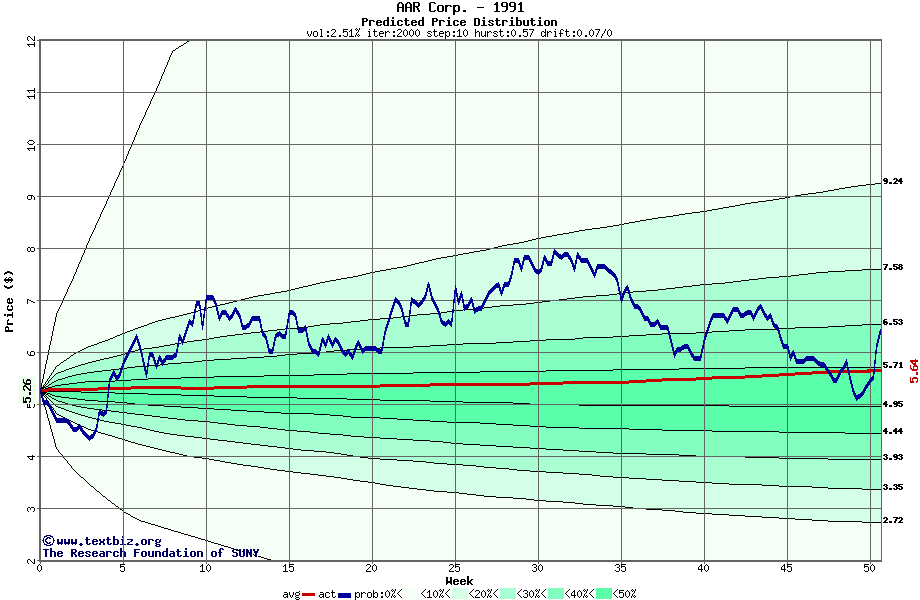 The following graph plots the year-to-date performance of the stock for 1991 compared to the probability calculated by a random walk model.