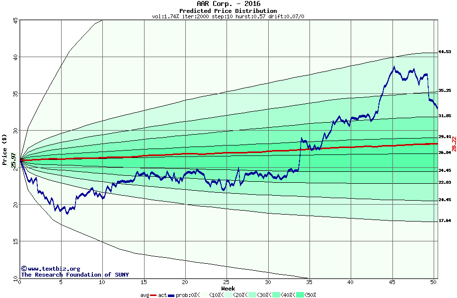 The following graph plots the year-to-date performance of the stock for 2016 compared to the probability calculated by a random walk model.