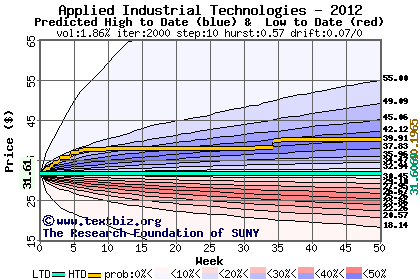 The high to date and low to date prices of the stock plotted against a random walk model for 2012 (what's this?).