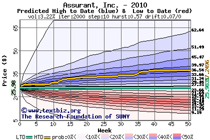 The high to date and low to date prices of the stock plotted against a random walk model for 2010 (what's this?).