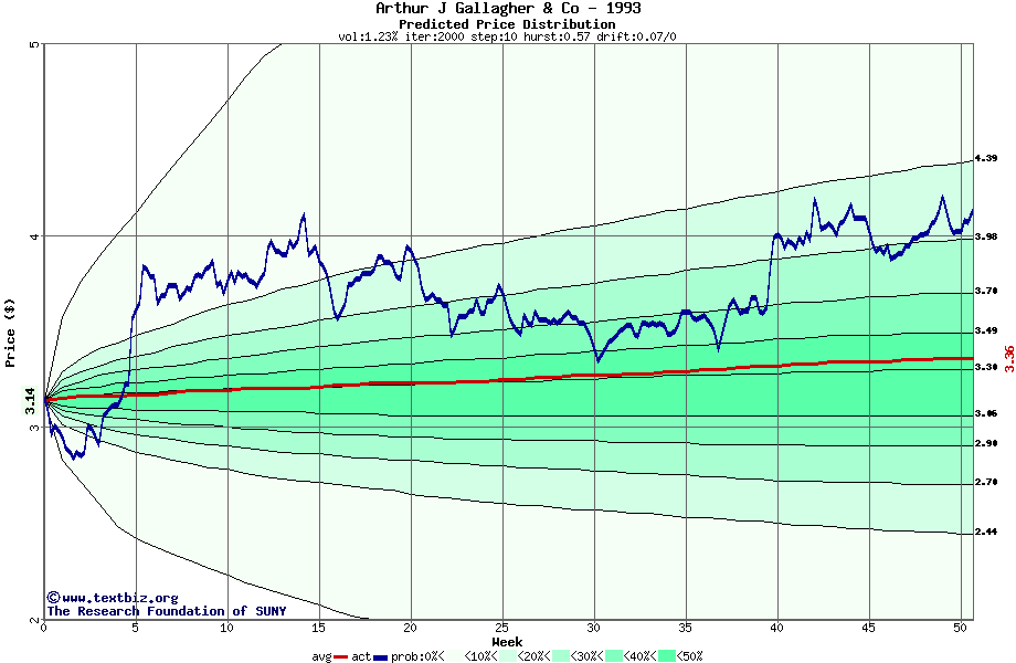 The following graph plots the year-to-date performance of the stock for 1993 compared to the probability calculated by a random walk model.