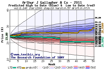 The high to date and low to date prices of the stock plotted against a random walk model for 2011 (what's this?).