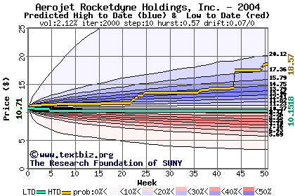 The high to date and low to date prices of the stock plotted against a random walk model for 2004 (what's this?).
