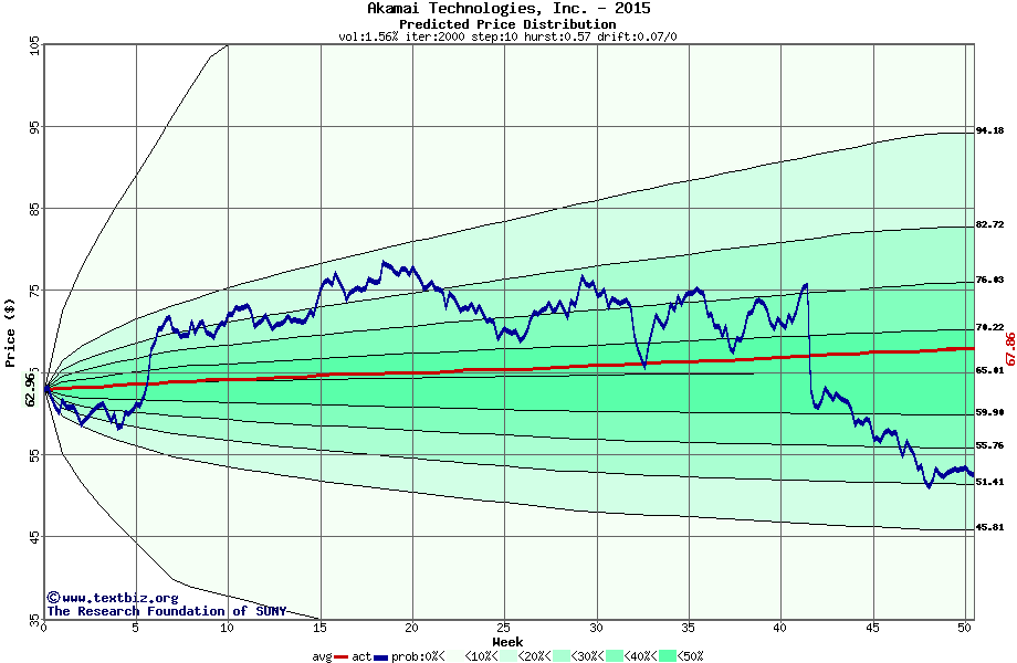 The following graph plots the year-to-date performance of the stock for 2015 compared to the probability calculated by a random walk model.