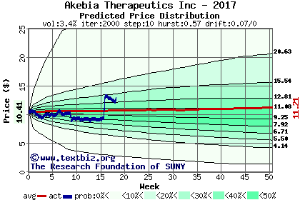 The high to date and low to date prices of the stock plotted against a random walk model for 2017 (what's this?).