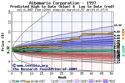 The high to date and low to date prices of the stock plotted against a random walk model for 1997 (what's this?).