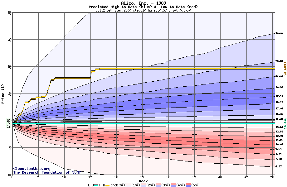 The following graph plots the year-to-date performance of the stock for 1989 compared to the probability calculated by a random walk model.