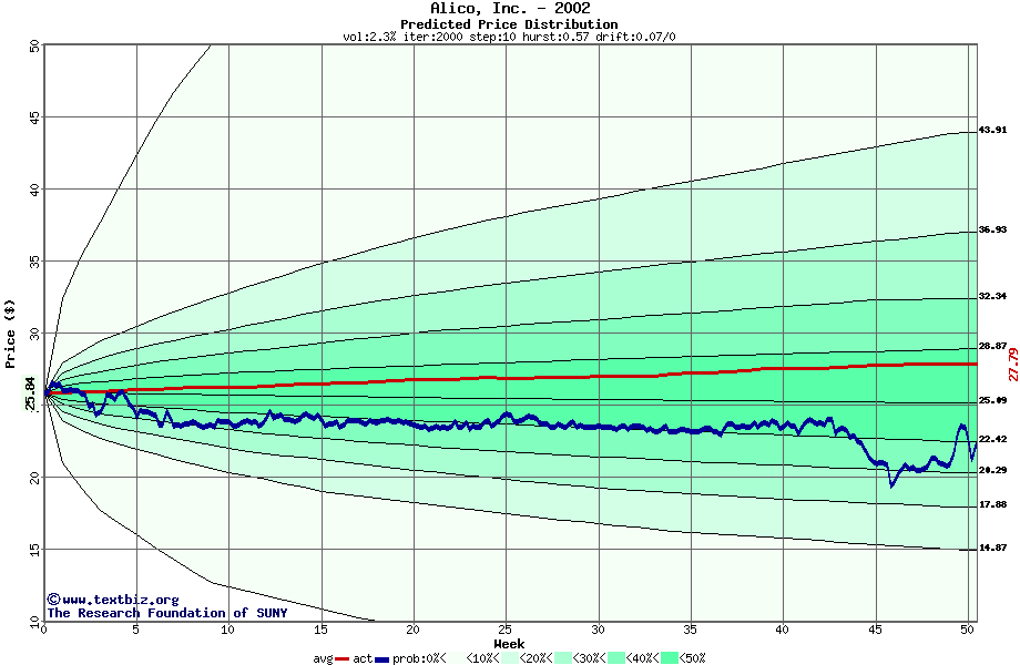 The following graph plots the year-to-date performance of the stock for 2002 compared to the probability calculated by a random walk model.