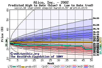 The high to date and low to date prices of the stock plotted against a random walk model for 2002 (what's this?).