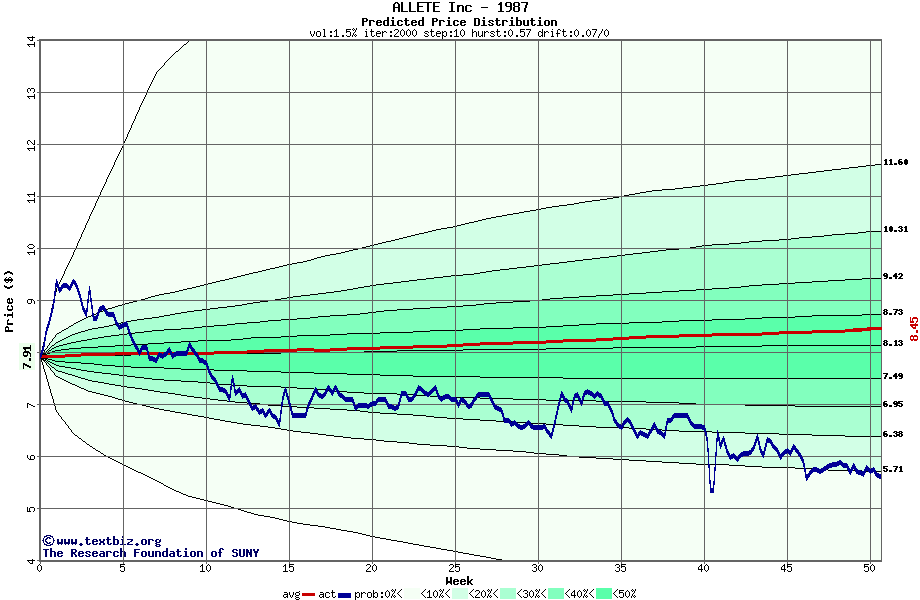 The following graph plots the year-to-date performance of the stock for 1987 compared to the probability calculated by a random walk model.