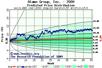The high to date and low to date prices of the stock plotted against a random walk model for 2000 (what's this?).