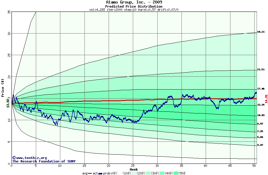 The following graph plots the year-to-date performance of the stock for 2009 compared to the probability calculated by a random walk model.