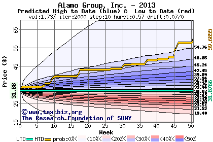 The high to date and low to date prices of the stock plotted against a random walk model for 2013 (what's this?).