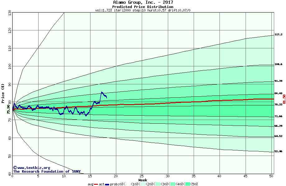The following graph plots the year-to-date performance of the stock for 2017 compared to the probability calculated by a random walk model.