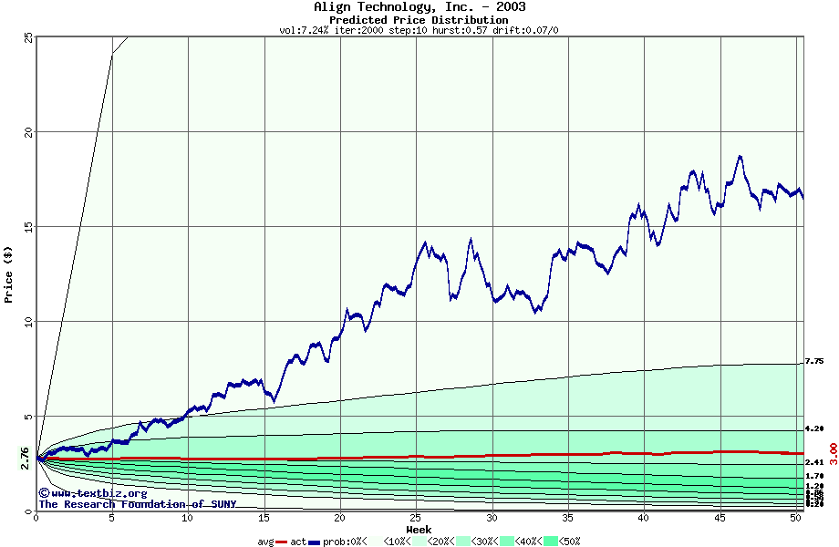 The following graph plots the year-to-date performance of the stock for 2003 compared to the probability calculated by a random walk model.