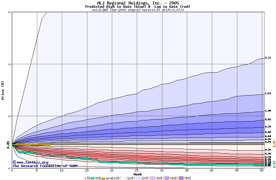 The high to date and low to date prices of the stock plotted against a random walk model for 2005 (what's this?).