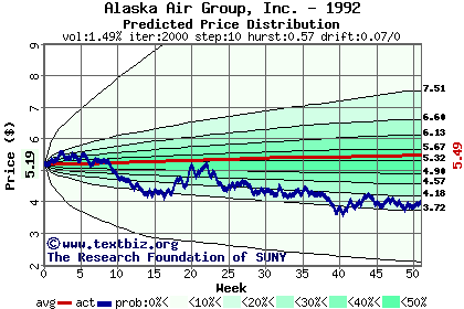The following graph plots the year-to-date performance of the stock for 1992 compared to the probability calculated by a random walk model.