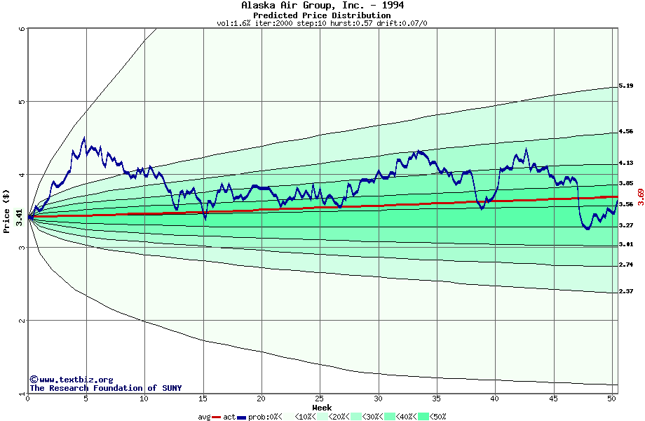 The high to date and low to date prices of the stock plotted against a random walk model for 1994 (what's this?).