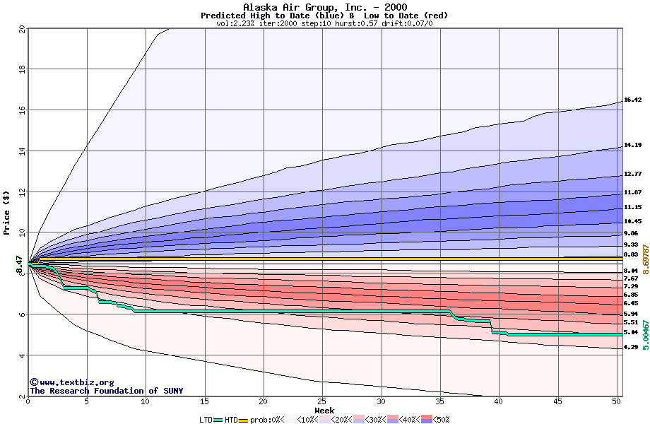 The high to date and low to date prices of the stock plotted against a random walk model for 2000 (what's this?).